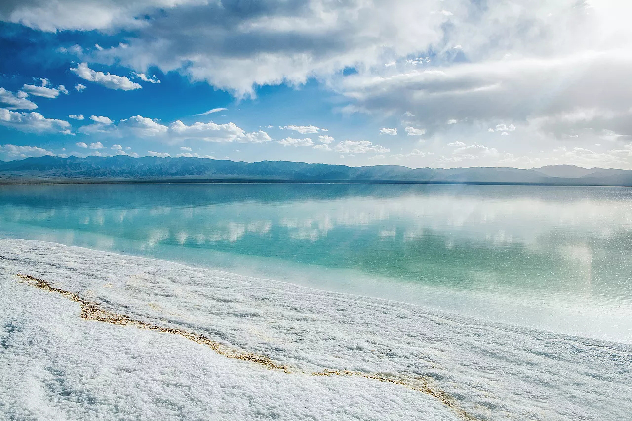 【東臺吉乃爾湖】(游覽時長約 0.5H)一個短時間風靡全國的網紅景點,雖然是高原鹽水湖,但它的湖 水卻像大海一般,充斥在瞳孔中的藍,更接近于翠綠色,是如同代表著幸福與浪漫的蒂芙尼寶石的高貴色澤。柔軟而潔白的湖灘是鹽的結晶,像是融化的奶酪般細膩,被很多人稱其為中國大西北的馬爾代夫。
