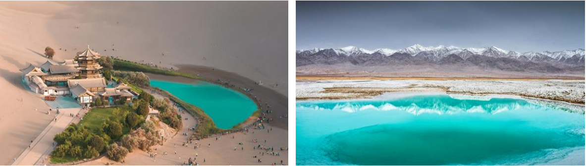 早餐后參觀【鳴沙山月牙泉】(游覽約 2 小時) 古往今來以“山泉共處,沙水共生”的奇妙景觀著稱于世,被譽為“塞外風光之一絕”1994 年被定為國家重點風景名勝區(qū),鳴沙山有流沙積聚而成,沙體遇到摩擦震動,便會殷殷發(fā)聲,輕若絲竹,重如雷鳴,故名“鳴沙山”,月牙泉位于鳴沙山北麓,因外形酷似一彎新月,故名“月牙泉”。千百年來不被流沙淹沒,不因干旱而枯竭。后乘車赴大柴旦,途中翻越黨金山,抵達【大柴旦翡翠湖】,大柴旦湖又稱為“翡翠湖”位于青海省海西蒙古族藏族自治州境內,形態(tài)迥異、深淺不一的鹽池宛如一塊塊晶瑩剔透的“翡翠”。約 6 平方公里的“翡翠湖”是原大柴旦化工廠鹽湖采礦隊采礦區(qū),經(jīng)多年開采形成采坑,變成了如今美麗的“翡翠湖”,站在湖邊,宛若鏡面般的湖面倒影著藍天白云和皚皚雪峰,宛如仙境。游畢入住酒店。